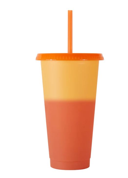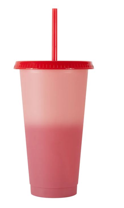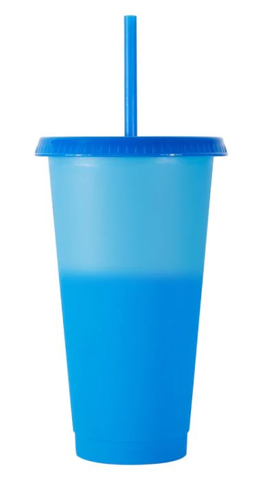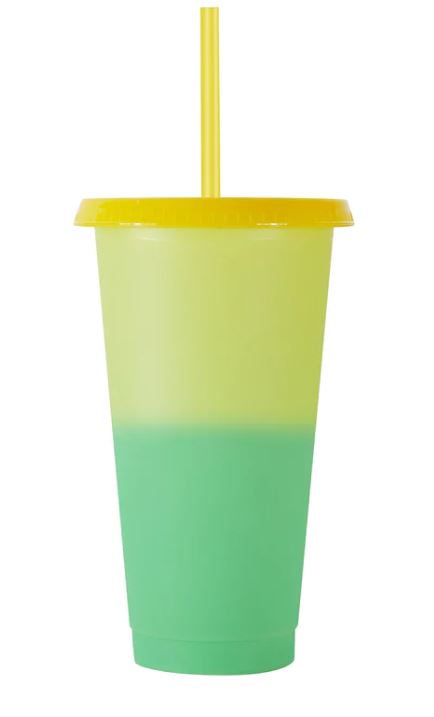 This 24 oz color changing tumbler comes with a reusable lid and straw.